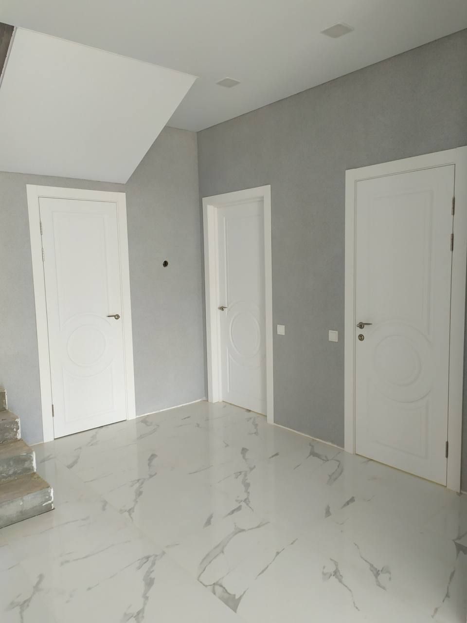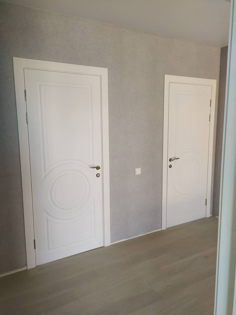 Красивые, стильные двери в красивый, стильный дом, не так ли? Несколько пафосные, в греческом стиле белые двери- находка для интерьера в стиле неоклассика. Данные модели прекрасно перекликаются с напольным покрытием- керамогранитом и неброским, томным серым цветом стен